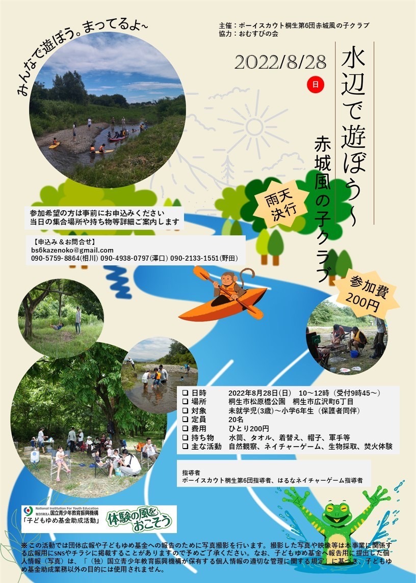 前回に続き、今回も水辺の集会として、ボーイスカウト桐生第6団赤城風の子クラブ主催「水辺で遊ぼう」に参加してきました。朝から雨が降ったりやんだりの天候でしたが、さすが雨天決行!「水辺で遊ぼう」は、普通に開催されていました。途中で何度か大雨になりましたが全く意に介さず。子供たちは、水の中でずっと遊んでいました。楽しい一日を過ごせました。