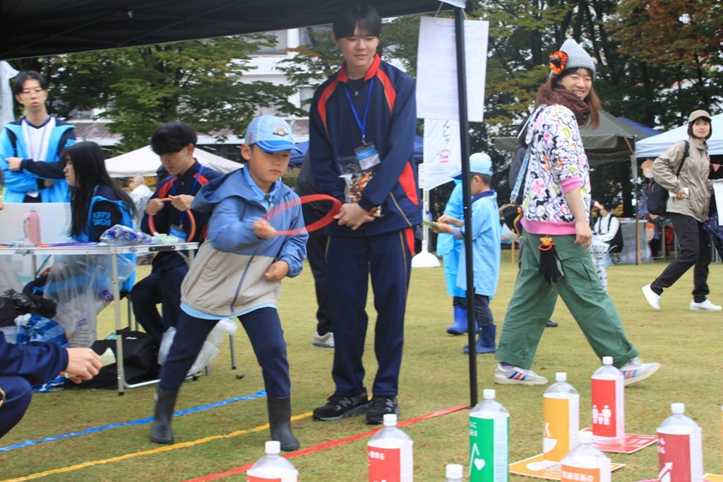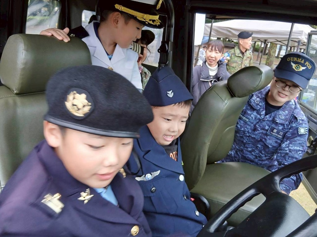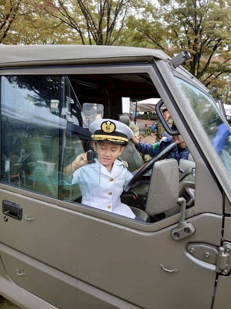 まずは狙いを定めて「それっ!」とわなげに挑戦🎯✨ 景品ゲットに大成功🙌!そして、自衛隊のブースへGO!かっこいい制服を着て、記念写真📸パチリ!ついでに自衛隊車両にも乗せてもらって、気分はヒーローさ💪✨