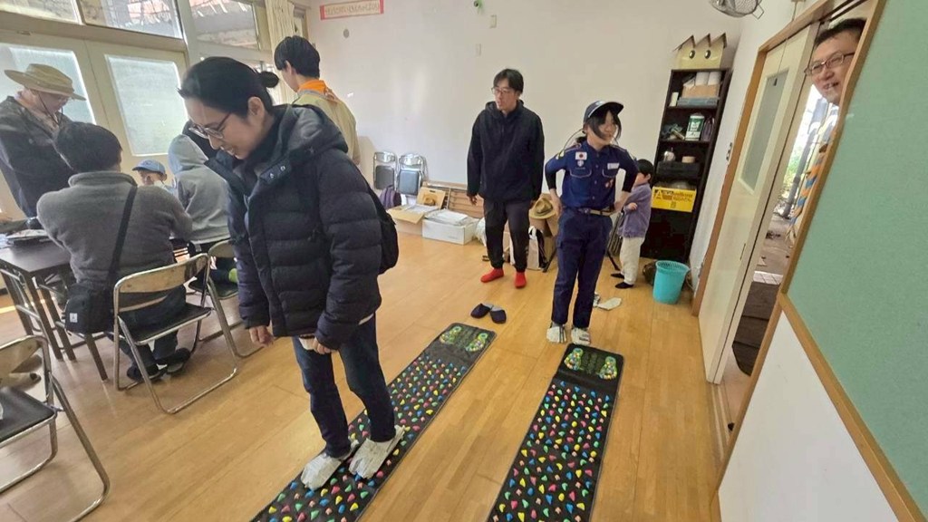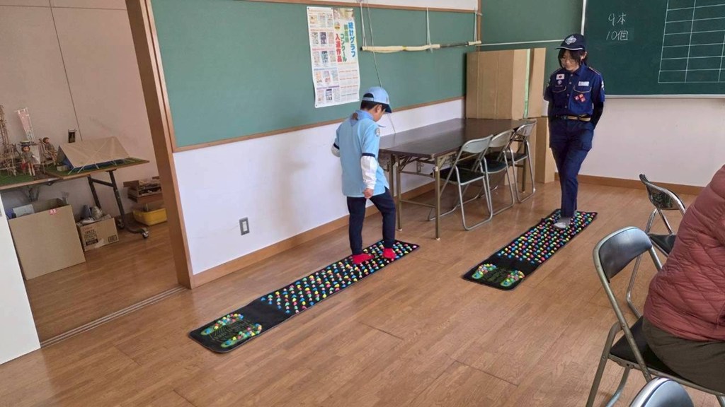 もしも大きな地震が起きたら、床にはガラスの破片や危ないものが散らばってしまうかもしれません。そんなとき、裸足で歩いたら大変! でも大丈夫! 災害時に家にある「新聞紙」が、みんなの足をしっかり守る最強アイテムに大変身! このプログラムでは、新聞紙を折って、オリジナルの「新聞スリッパ」を自分で作りました。参加された保護者の方からは「実際に新聞の強さを実感できました」「大人の方も実感できた内容でした!」と、その実用性に驚きの声が。自分で作ったスリッパを履き、チクチクする足つぼシートの上を歩いて、防災の知恵をゲットしました!🗞️