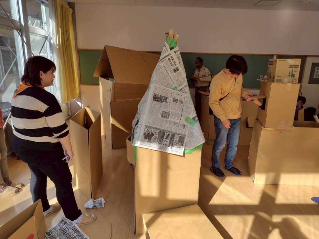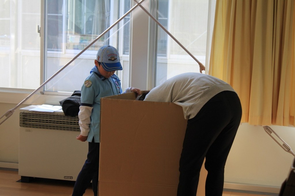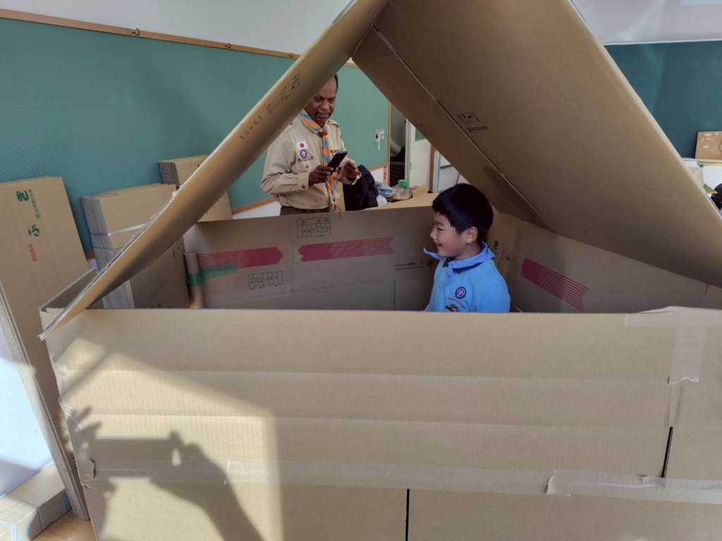 もし大きな災害で避難所に行くことになったら、みんなのプライベートはどうなるかな? このプログラムは、参加者から最も満足度の高かった活動の一つです!用意された段ボールを使って、チームごとに自分たちだけの「ひみつきち」(プライベート空間)を作り上げました。 「避難所での生活を思い浮かべて作れた」「ずっとやりたがっていたので楽しそう」「ダンボールを好きなように作れたのがよかった」といった感想が寄せられ、子どもたちの創造力と協力する力が爆発!段ボールがプライバシーを守る大切な道具になることを、楽しく学びました🏠。