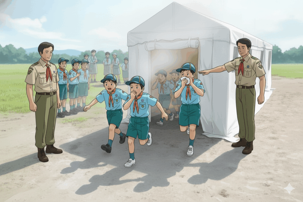 建物の中で火事が起こったら、一番怖いのは煙です。もし避難する途中で煙に包まれたら、君たちはどうする? このプログラムでは、無害な白い煙を充満させ、前が見えない状況での避難を体験しました。まるで雲の中を進むような、ドキドキのミッションです! 「前がまったく先が見えずこわい体験ができました」「初めての体験で大人も勉強になりました」という声もあり、参加者は低い姿勢になって安全に脱出する命を守る練習を真剣に行いました。勇気と知恵を使い、力を合わせて煙の迷路から大脱出に成功しました!