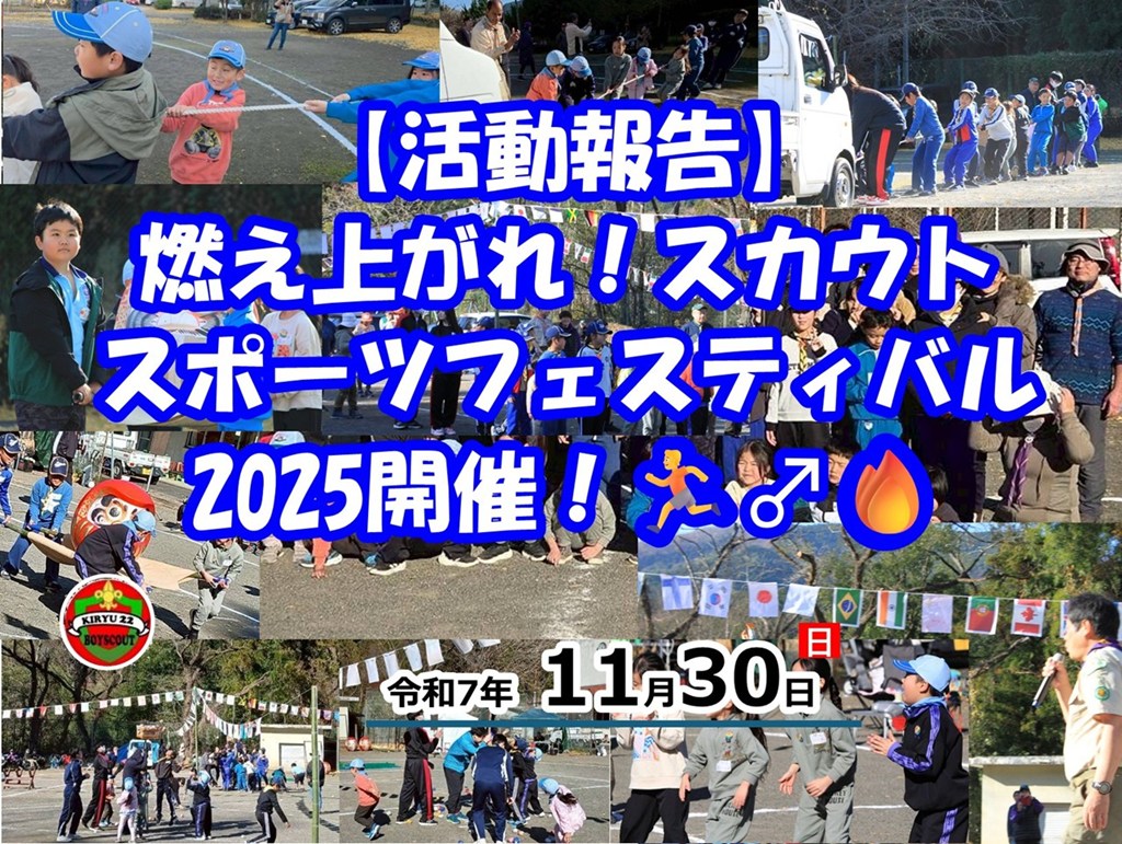 11月30日、キノピーの森キャンプ場で「スカウトスポーツフェスティバル2025」を開催しました。前日からの手作り準備を経て、当日は桐生地区のスカウトが大集合。巨大なダルマを運ぶ競技やユニークな「軽トラ綱引き」、ダンスを交えた「玉入れ」で白熱しました。お弁当休憩の後は、煙幕や竹ぽっくり作り、パン食い競争など障害物を越える「スパルタンリレー」に挑戦。天候にも恵まれ、笑顔と躍動感あふれる最高の一日となりました。