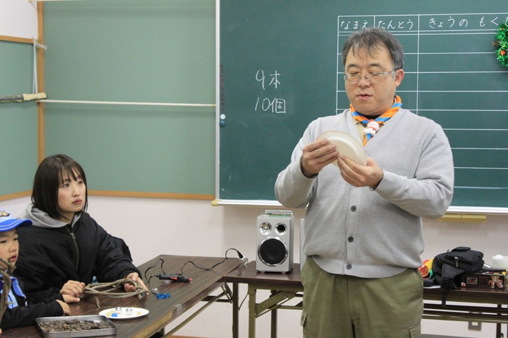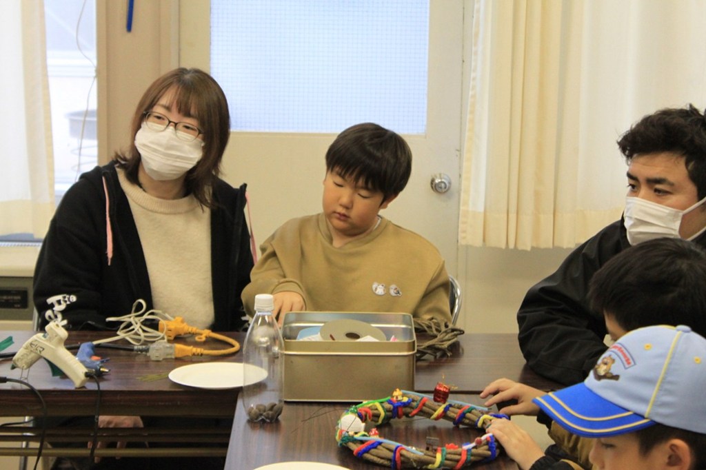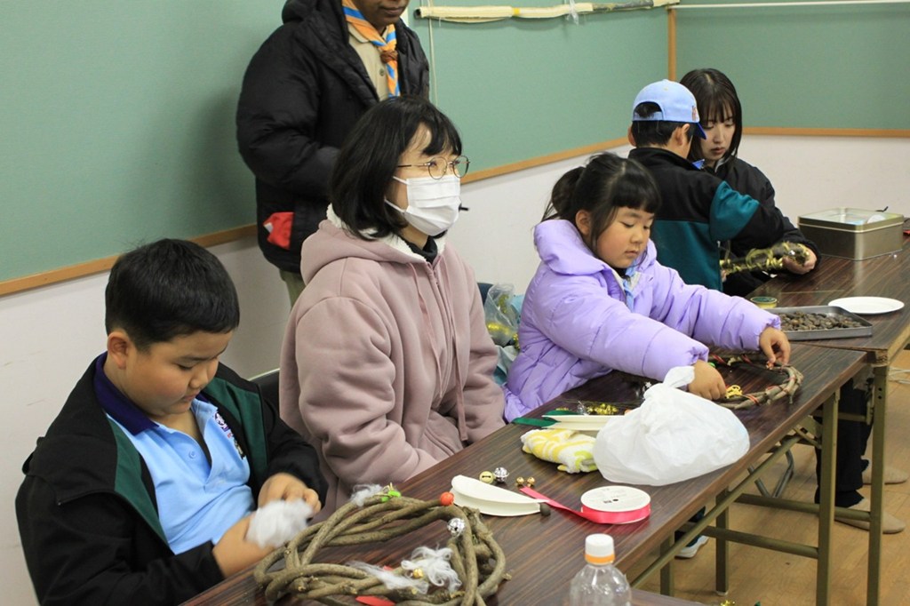 「リズムを刻め!クリスマス楽器工房」では、マラカスとタンバリンの2種類を作成。マラカスは持参したペットボトルとビーズを使い、タンバリンは紙皿をベースに作るだけでなく、自然の素材を使ったリースを土台にするなど、スカウトたちは個性豊かな楽器を完成させました。
