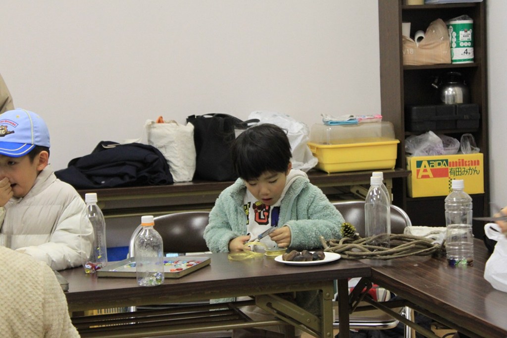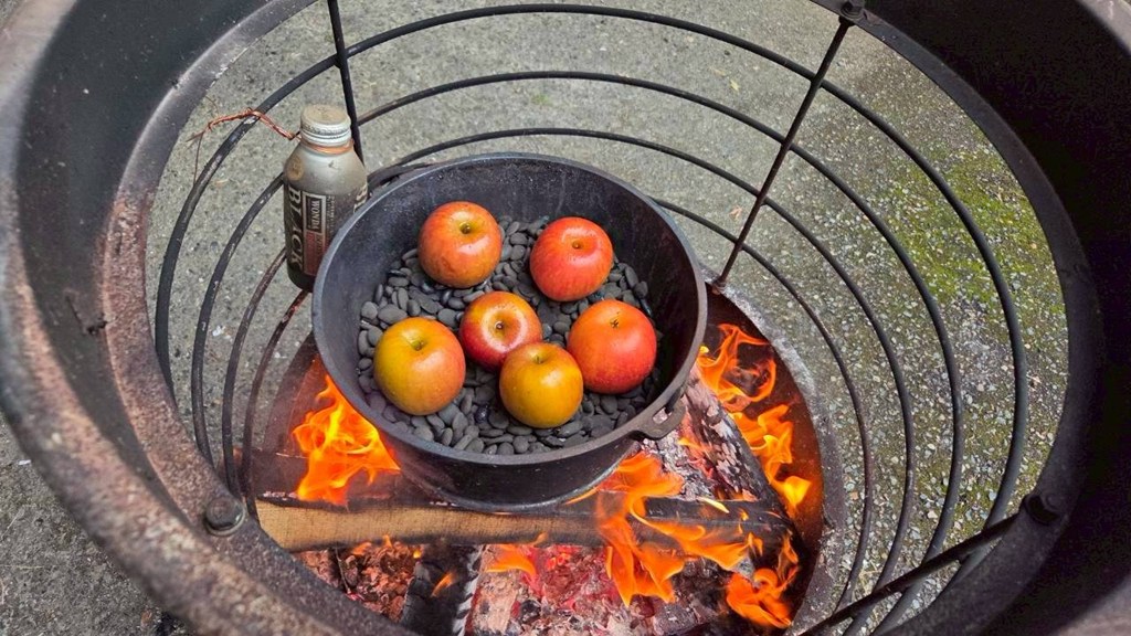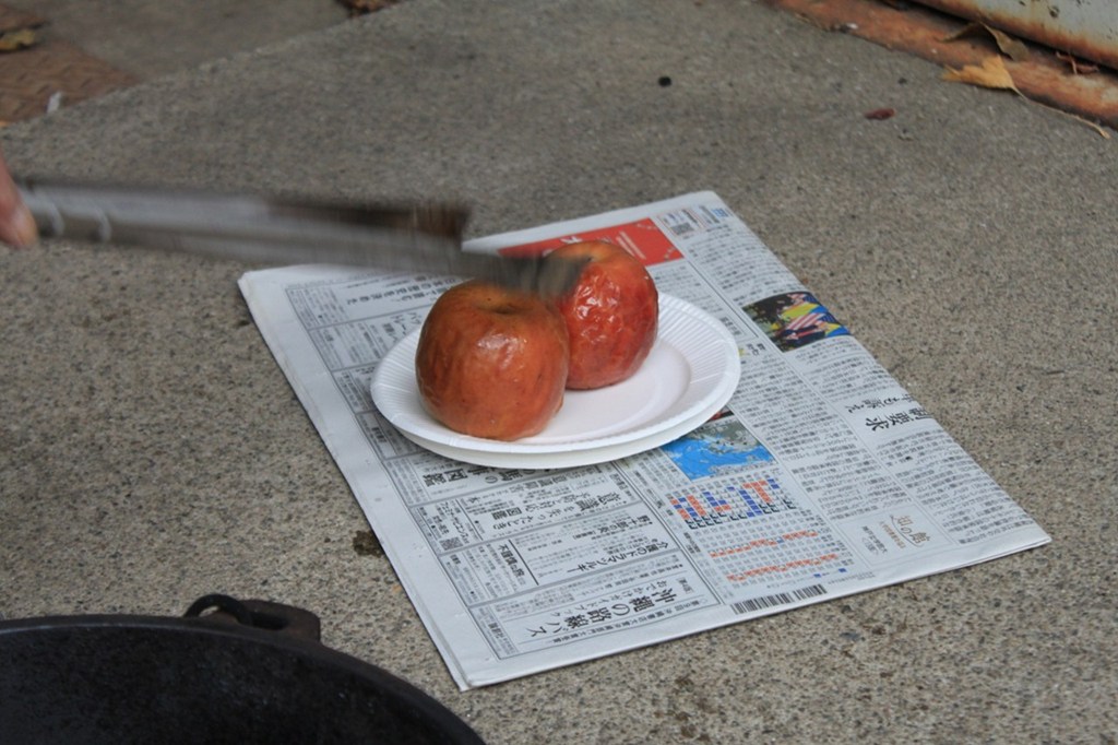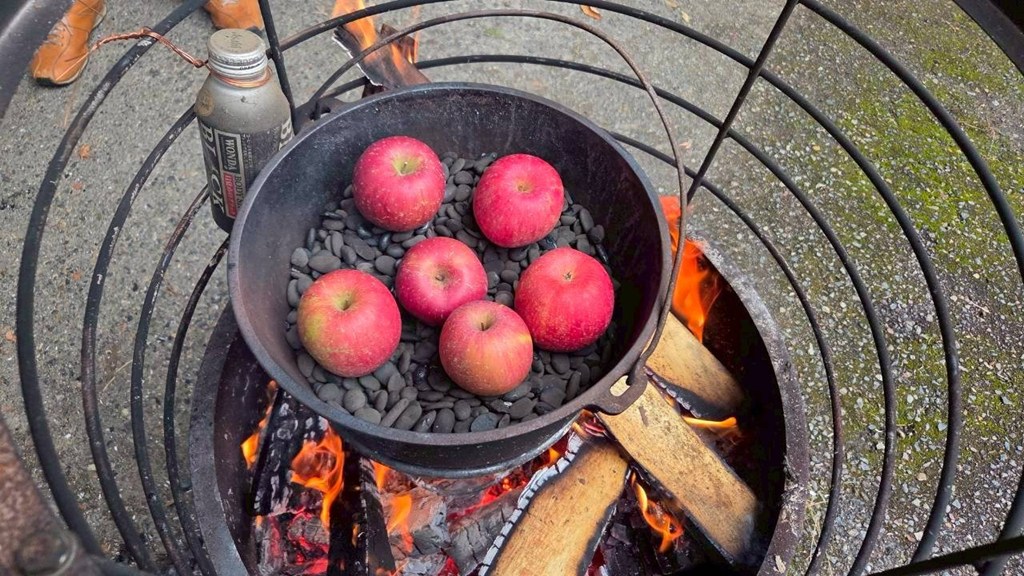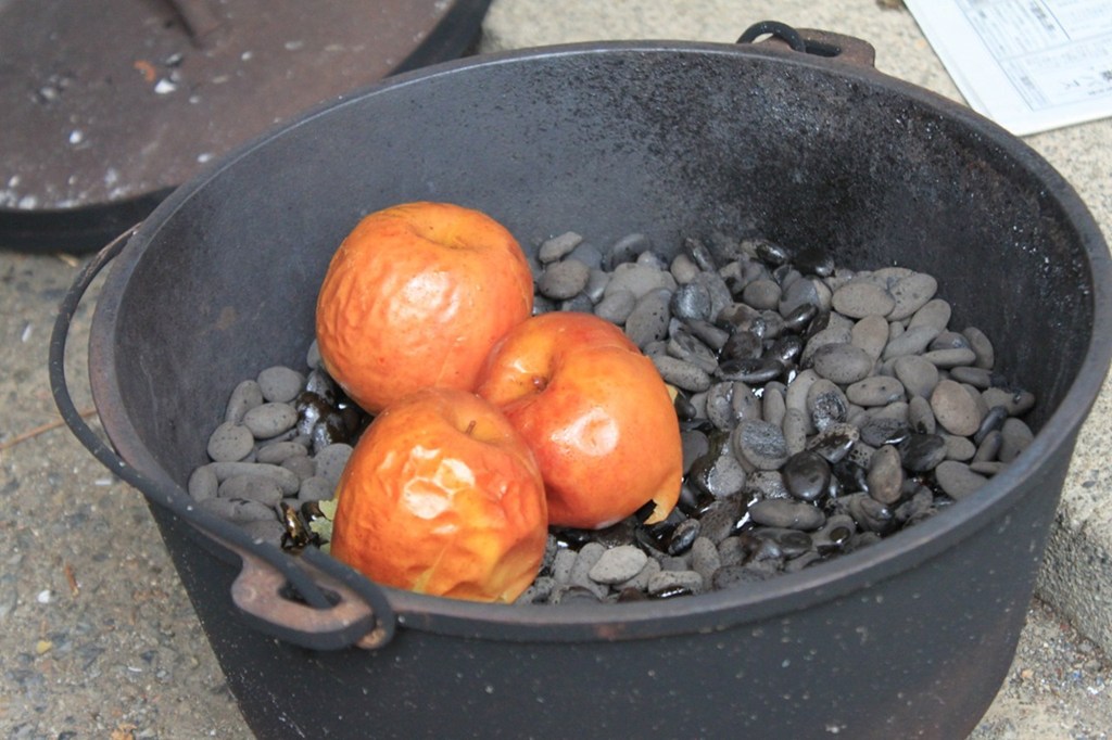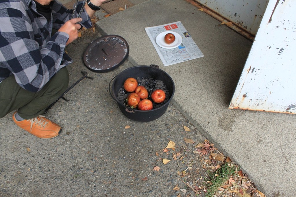 活動の合間には、ダッチオーブンで作った甘栗と焼きリンゴを楽しみ、冷えた体を温めました。