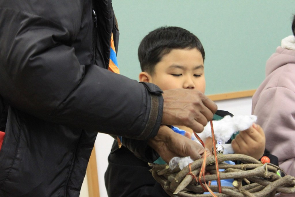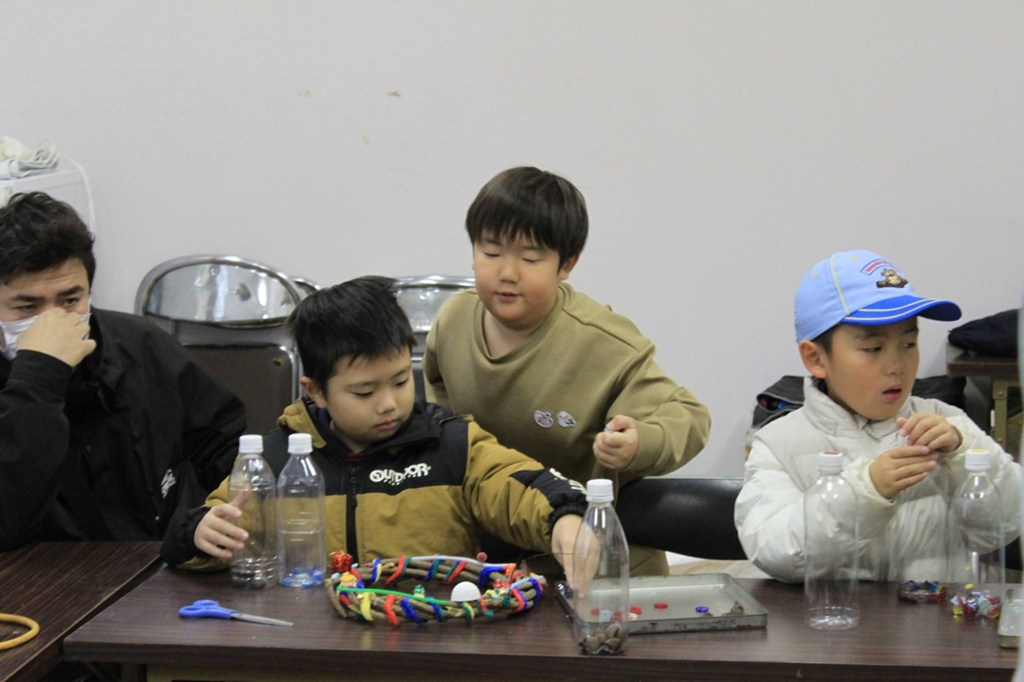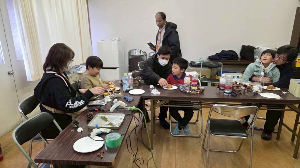12月14日、小雨の中「サンタも笑う!お楽しみ特訓会」を実施しました。集会前半(10:00〜11:30)は、クリスマス会発表に向けて、ペットボトルとビーズを使ったマラカス、紙皿やリースをベースにしたタンバリン作りを行いました。完成後、手作り楽器で「あわてんぼうのサンタクロース」の演奏練習を行い、リズム感を養いました。