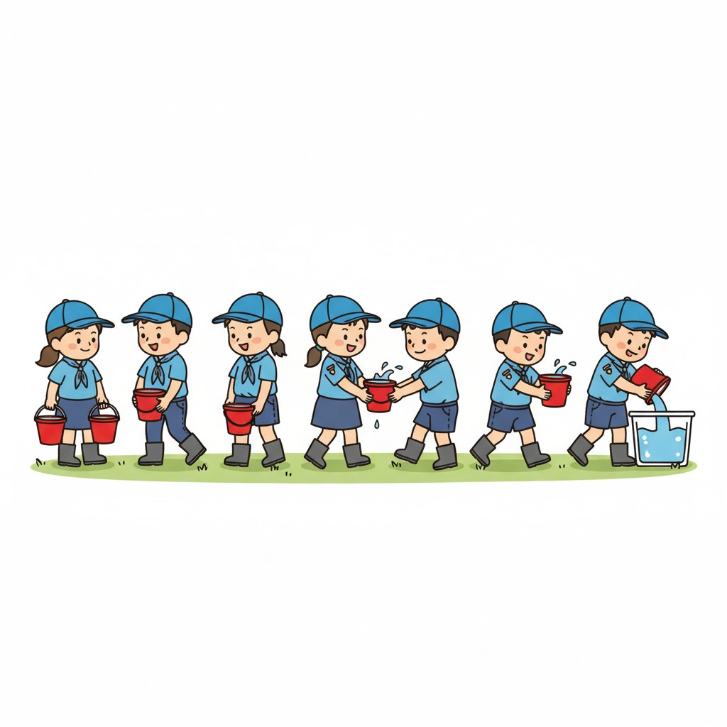 この体験では、君たちがチームに分かれて、力を合わせて水を運ぶバケツリレーにチャレンジします 。たくさん入れすぎると運びにくいこと 、声をかけあうことも大切だよ 。早く水をためたチームの勝ち!