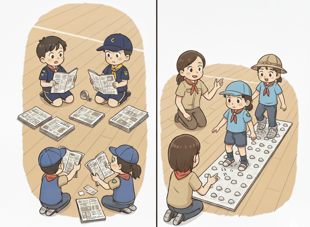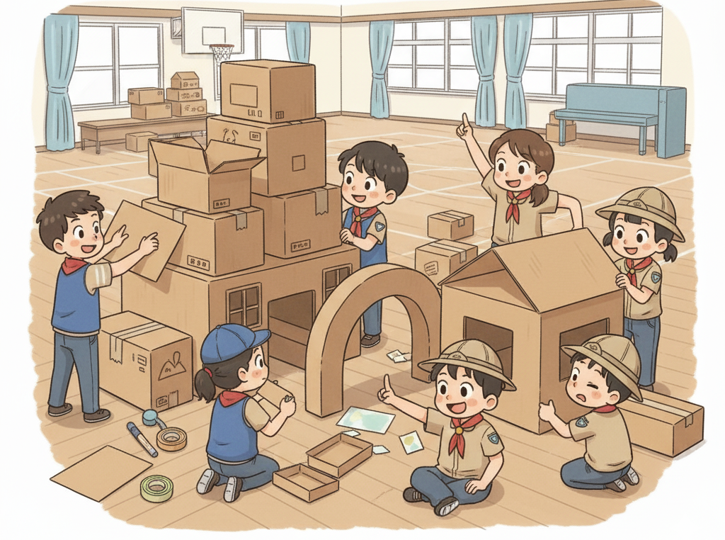 大きな段ボールをどうやって並べて、どうすれば中が見えにくくなるかな? 力を合わせ、知恵を絞って、安心して過ごせる自分たちだけの「部屋」を完成させよう!