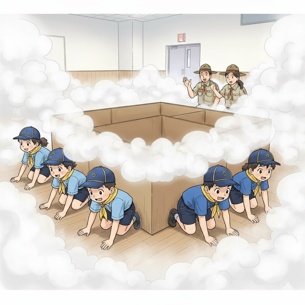 煙を体験することは、災害時に命を守るための大切な練習になります。年中さんから小学5年生まで、勇気と知恵を使い、みんなで力を合わせて煙の迷路から大脱出に成功しよう! 最高の「共助」体験が君たちを待っている!