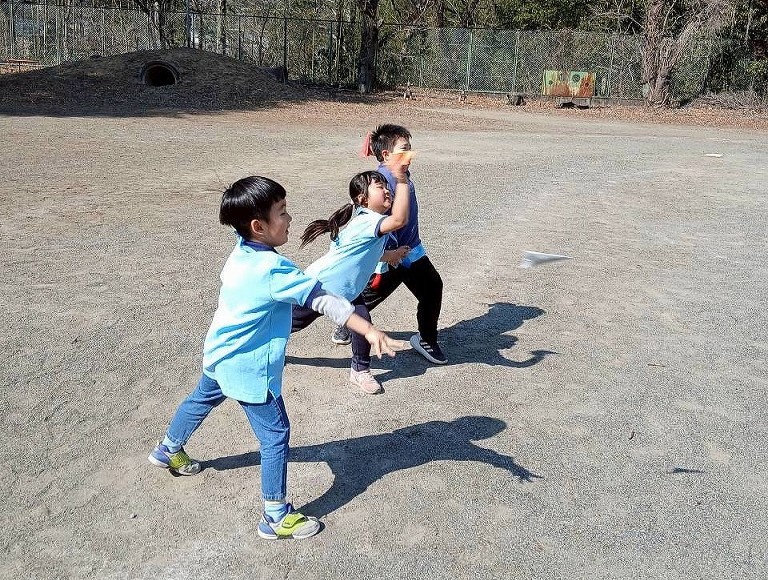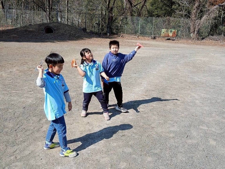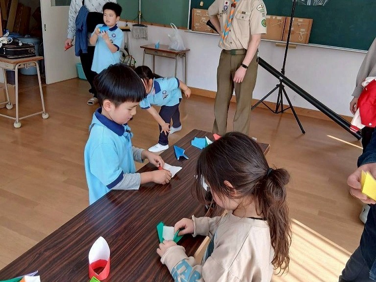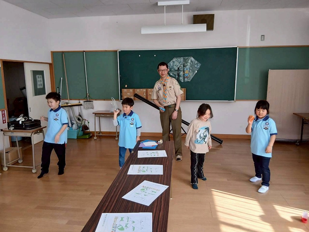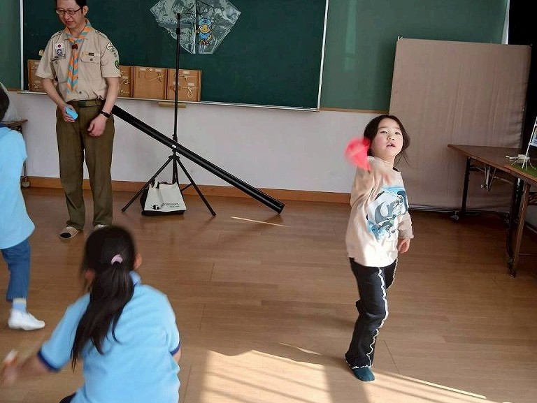 後半は、折り紙で「輪っかの飛行機」や「紙飛行機」作りに挑戦。予想以上に遠くまで飛ぶ飛行機に、スカウトたちからも歓声が上がりました🚀 それぞれの個性が光る、世界に一つだけの飛行機が青空に向かって飛び出しました。