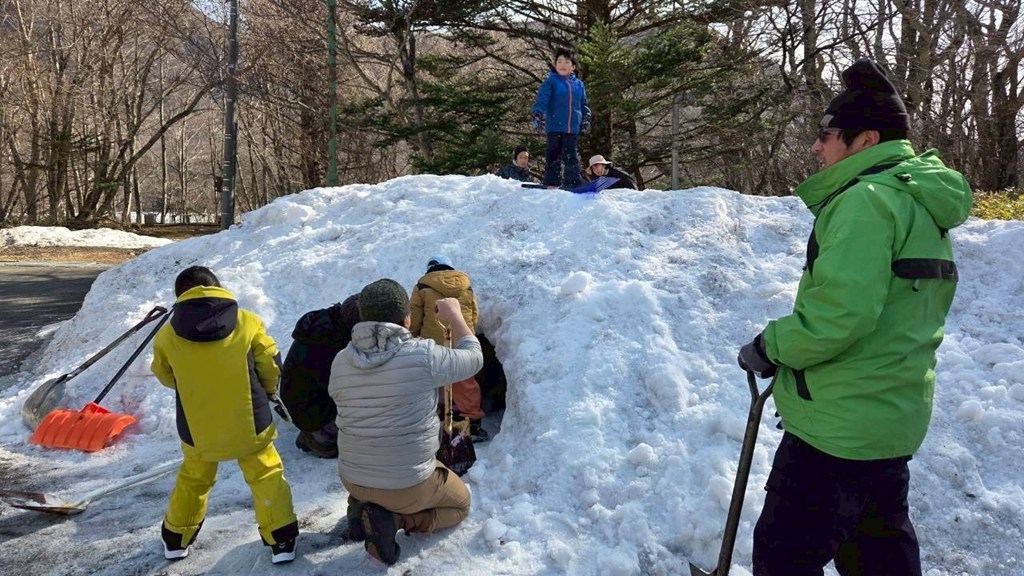スコップを使い、みんなで協力して雪を積み上げます!「ここはもっと固めて!」「入り口はこのくらいかな?」と工夫しながら、素敵な雪の家が完成しました。🏠
